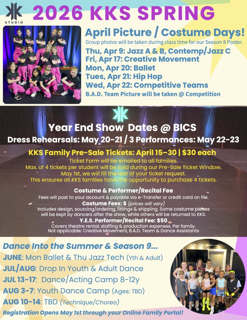 A max. of 4 tickets per student will be sold during our Pre-Sale Ticket Window. On May 1st, we will fill the rest of your ticket request if possible. This is to ensure that all dance families have the opportunity to purchase 4 tickets.